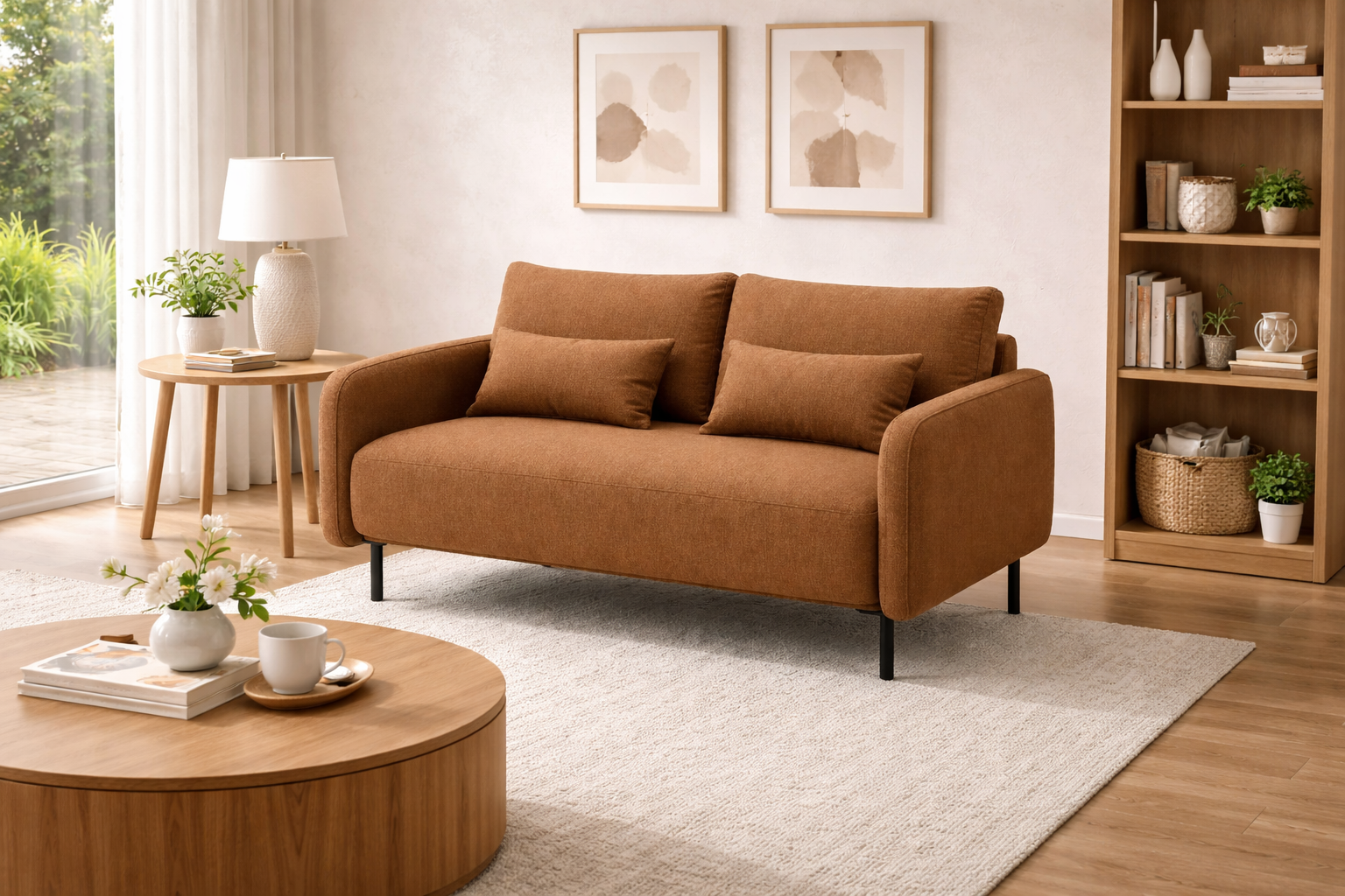 Dieses kompakte 2-Sitzer Sofa überzeugt mit modernem Design, hohem Komfort und vielseitiger Einsetzbarkeit. Die klare Linienführung, die weich gepolsterten Armlehnen und die warmen Brauntöne verleihen dem Sofa eine stilvolle und gemütliche Ausstrahlung. Dank der kompakten Größe eignet es sich ideal für Wohnzimmer, Apartment, Büro oder Gästezimmer.
